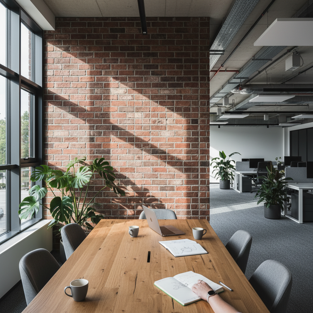 Kontorinteriør skifter stil nesten like raskt som mote. Én periode dominerer fargerike vegger og åpne landskap, neste periode er det beige soner og fokusrom som gjelder. Midt i dette gir tegl en form for langsom estetikk. Overflaten eldes med verdighet, og patinaen oppleves som en styrke, ikke en svakhet.